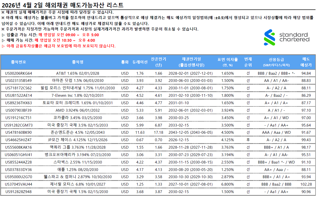 해외채권 중개가능자산 리스트 2026년 4월 2일